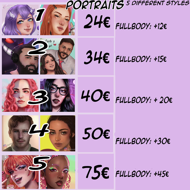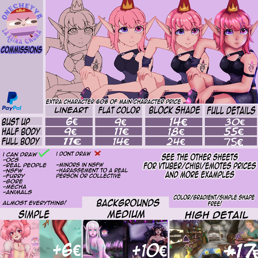 1.Write to me on Instagram @onecheyya2 or send me an email at [email protected], where you can tell me what you need and how you want it.2. I'll provide you with a quote, which usually will be the same or lower than the price list (since I often offer discounts), unless it's an NSFW drawing, in which case it will depend on the specific drawing.3.Once the price and the commission details are clear, you'll need to pay in advance through PayPal. I'll start working as soon as the payment is received.4.Throughout the process, I'll show you the sketch and everything else so you can request any changes. During the sketch and draft phase, you can make several changes to the drawing at no extra cost.5.When the drawing is more advanced,each change that is not very subtle will cost an additional +5€. Once finished, I'll send it to you via email or drive (for vtubers) so you'll have it in HD.I usually take from 3 days to 1 week to finish drawings, depending on their complexity. If there's a deadline, please let me know in advance. For express drawings with a deadline of 3 days or less, there will be a small additional fee.If you want your drawing to be available for commercial use, please let me know in advance. In many cases, there won't be an issue, but in others, there may be a small additional fee.Feel free to ask for a quote and any questions you have whenever you want. Have a great day!ESPAÑOL1.Escribeme a Instagram @onecheyya2 o enviame un email a [email protected], ahi comentame qué necesitas, como lo quieres y te daré un presupuesto, normalmente será igual o inferior a la tabla de precios (ya que suelo hacer ofertas) a menos que sea un dibujo NSFW que ahi dependerá del dibujo en cuestión2. Cuando quede claro el precio y el dibujo/vtuber/encargo a realizar deberas pagar por adelantado a través de PayPal, me pondré a trabajar en cuanto esté pagado.3. Durante el proceso te iré enseñando el sketch y todo por si quieres cambiar cualquier cosa, durante la fase de sketch y boceto puedes cambiar el dibujo varias veces sin coste alguno4.Cuando ya esté mas avanzado el dibujo, cada cambio que no sea algo muy sutil costará +5€, una vez acabado te lo enviaré por email o drive (vtubers) para que lo tengas en HD5. Suelo tardar de 3 dias a 1 semana en terminar los dibujos, dependiendo de su complejidad, si es con fecha límite recuerda avisarme con antelación, si es un dibujo express con fecha limite en 3 dias o menos habrá tambien un pequeño plus6. Si quieres que tu dibujo pueda usarse de forma comercial avisame tambien antes, en muchos casos no habrá problema y en otros se cobrará otro pequeño plusPregunta sin miedo tu presupuesto y dudas cuando quieras, tenga un buen dia