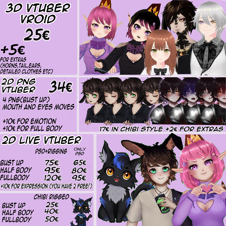Lineart | Flat Color | Cell shading | Full Details | 3D Vtuber Vroid | 2D PNG Vtuber | 2D Live Vtuber (art+rigged) | 2D Live Vtuber (only art) | 2D Live Chibi Vtuber | |