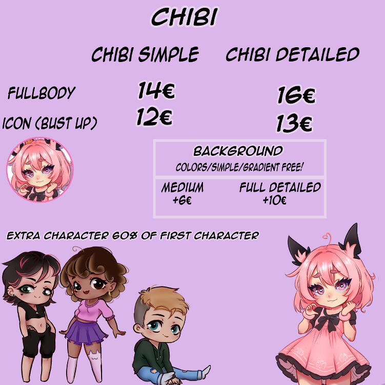 Extras | extra | character | 30% | off | +5€ (horns,tail,detailed clothes etc) | +10€ for expression | +10€ for expression (2 free!) | . | +5€ for expression (2 free!) |